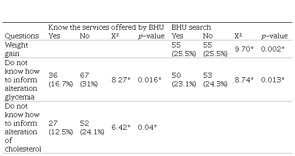 Table 4 shows the link between BHU knowledge about the services provided and seeking BHU assistance. It can be observed that more than 25% (n=55; X² = 9.7; p= 0.002) of individuals who experienced weight gain during the pandemic did not seek BHU assistance. Furthermore, data on misinformation regarding changes in blood glucose levels show that 67 individuals (31%) could not provide information about the services offered by the BHU (X² = 8.27; p= 0.016). Similarly, over 24% (n=53; X² = 8.74; p= 0.013) of the population unaware of changes in blood glucose levels during the pandemic do not seek assistance at the BHU. The same can be observed for individuals unaware of changes in cholesterol levels during the pandemic and lacking knowledge about the services offered by the BHU (n=52; X² = 6.42; p= 0.04).