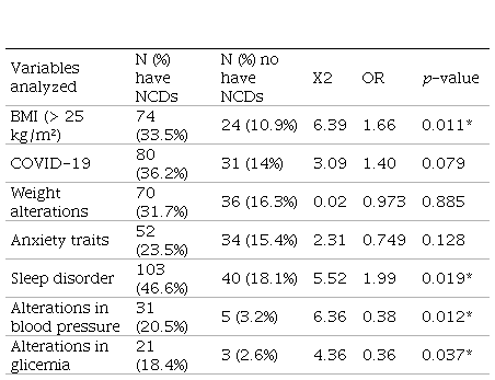 Based on the results found, we can observe in Table 5 that individuals classified as overweight and obese based on BMI have a 66% (OR=1.66; p= 0.011) higher chance of developing NCDs when compared to individuals with normal weight. Regarding sleep quality, individuals with any NCD have nearly twice the chance of developing sleep disorders (OR=1.99; p= 0.019). On the other hand, altered blood pressure and glucose levels were more present in patients with established NCDs (32/20.5% and 21/18.4%. respectively). However, it can be observed that individuals without NCDs who also did not develop changes in blood pressure and glucose levels are more prevalent (OR=0.36; p= 0.037).