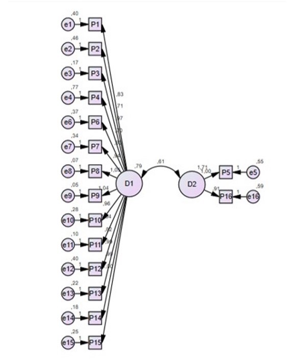 En la Figura 1 se presenta el modelo final de dimensiones e ítems para la escala a partir de los dos factores extraídos del análisis factorial exploratorio. Los resultados mostraron un x² significativo (x² = 244.176; p = 0.000), razón por la cual observamos otros valores para conocer el ajuste del modelo propuesto. Los valores del RMSEA = 0.081, del CFI = 0.958 y del TLI = 0.951, indican un ajuste adecuado del modelo (Maureira, 2017; Morata et al., 2015).