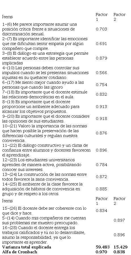 La prueba de Kaiser-Mayer-Olkin (KMO) muestra un valor de 0.961 y la prueba de esfericidad de Bartlett un p=0.000, por lo que se procedió a realizar un análisis factorial exploratorio a través de un análisis de componentes principales con rotación Varimax para identificar la estructura latente del instrumento. Este entregó la existencia de dos factores (Tabla 1) que explican el 74,913% de la varianza total, con 14 ítems que saturan en el Factor 1 (Responsabilidad socio afectiva), y dos en el Factor 2 (Regulación de convivencia). El alfa de Cronbach entrega un valor de 0.958 para los 16 ítems del instrumento.
