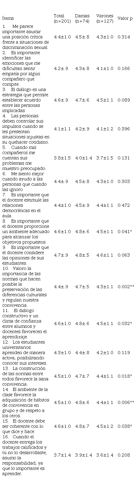 En la Tabla 2 se observa la prueba t para muestras independientes comparando los puntajes de cada ítem de la Escala de Competencias Ciudadanas según sexo, en que, en seis de los 16 ítems se observan diferencias entre damas y varones. En el ítem 8. Es importante que el docente proporcione un ambiente adecuado para alcanzar los objetivos propuestos (p = 0.041); 10. Valoro la importancia de las normas que hacen posible la preservación de las diferencias culturales y regulan nuestra convivencia (p = .002); 11. El diálogo constructivo y un clima de confianza entre alumnos y docentes favorecen el aprendizaje (p = 0.032); 13. La construcción de las normas entre todos favorece la sana convivencia (p = 0.018); 14. El ambiente de la clase favorece la adquisición de hábitos de convivencia en grupo y de respeto a los otros (p = 0.006); y 15. El docente debe ser coherente con lo que dice y hace (p=0.038) en que las mujeres arrojan las puntuaciones más altas.