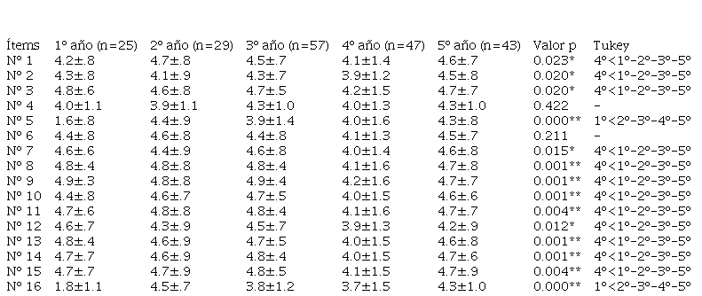 En la Tabla 3 se observan las pruebas ANOVA comparando los puntajes de cada ítem de la Escala de Competencias Ciudadanas según año en curso de la carrera de Pedagogía en Educación Física. En 14 de los 16 ítems se observan diferencias por cursos. Las pruebas post-hoc de Tukey muestran que los/as estudiantes de 4º año obtienen puntajes más bajos en 12 ítems, lo que se relaciona con una posición crítica frente a situaciones de discriminación sexual, la identificación de emociones, el diálogo como estrategia para obtener acuerdos; que el docente estimule las relaciones democráticas, proporcione un ambiente adecuado para alcanzar los objetivos y que considere las opiniones de sus estudiantes, etc. Los/as estudiantes de 1º año obtienen los puntajes más bajos en 2 ítems, relacionados con la preocupación por problemas de compañeros/as y asumir la responsabilidad por las calificaciones obtenidas.