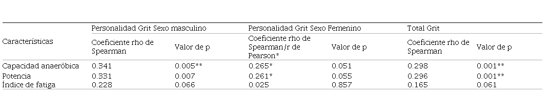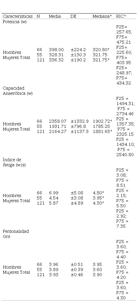 De acuerdo con los resultados obtenidos se pudo identificar una potencia anaeróbica total de (321.75; P25 = 248.97; P75 = 434.32) siendo esta variable superior en el sexo femenino de acuerdo con su medida de tendencia central. Por su parte, la capacidad anaeróbica total tuvo una mediana de (1881.65; P25 = 1434.10; P75 = 2540.80) y esta a su vez fue casi similar en ambos sexos. Con respecto al índice de fatiga de todos los participantes esta variable arrojo una mediana de 4.30, y al mismo tiempo fue superior en las mujeres cuando se comparó con los resultados de los hombres. Finalmente, la personalidad Grit fue superior en hombres (3,96 ± 0.51) frente a sus contrapartes las mujeres (3.89 ± 0.39).