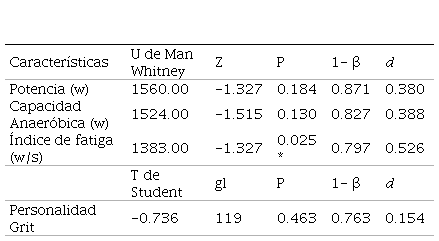 De acuerdo con las pruebas de U de Man Whitney y T Student, se pudo determinar que no existen diferencias significativas por sexo en las diferentes variables estudiadas; sin embargo, el índice de fatiga sí que estuvo cercano a la significancia p < 0,025, por lo que puede llegar a ser un indicador diferenciador entre hombres y mujeres en el rendimiento. Asimismo, se pudo determinar un tamaño de efecto pequeño en la variable de personalidad Grit, (≤ 0.20) y un tamaño del efecto mediano en las demás variables (≤ 0.50). Por otro lado, las variables potencia y capacidad anaeróbica arrojaron una fuerte potencia estadística 1-β = 0.871 y 1-β = 0.827 respectivamente. El índice de fatiga, por su parte, 1-β = 0.797 y la personalidad Grit 1-β = 0.763, estuvieron por debajo 1-β ≤ 0.80.(Tabla 2)