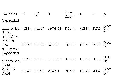 Después de obtenidas las 6 salidas de potencia de cada uno de los sprints, se procedió al cálculo de la capacidad anaeróbica, la que se obtiene mediante el trabajo total completado durante la duración de la prueba; es decir, la suma de todas las salidas de potencia máxima.