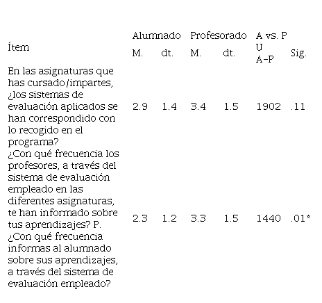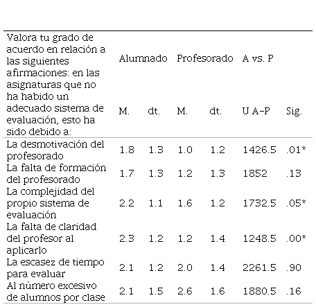 En la Tabla 5, se presentan las valoraciones que el alumnado y profesorado dan a una serie de afirmaciones vinculadas a razones por la que los sistemas de evaluación vivenciados no han funcionado. Según la percepción del alumnado, las ocasiones en donde no ha habido un adecuado sistema de evaluación es debido a “La falta de claridad del profesor al aplicarlo”; esta percepción, además, es significativamente más elevada que la del profesorado para el mismo ítem.