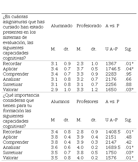 En la Tabla 2, se pueden ver las percepciones que tienen los estudiantes y profesores en cuanto a la presencia de diferentes capacidades cognitivas en los sistemas de evaluación. De las tres capacidades cognitivas que obtuvieron diferencias significativas entre la percepción del profesorado vs. el alumnado, la capacidad cognitiva de “Recordar” obtuvo valoraciones significativamente más elevadas por parte del alumnado. Mientras que las capacidades cognitivas de ”Aplicar” y “Valorar” obtuvieron diferencias significativamente más elevadas por parte del profesorado.
