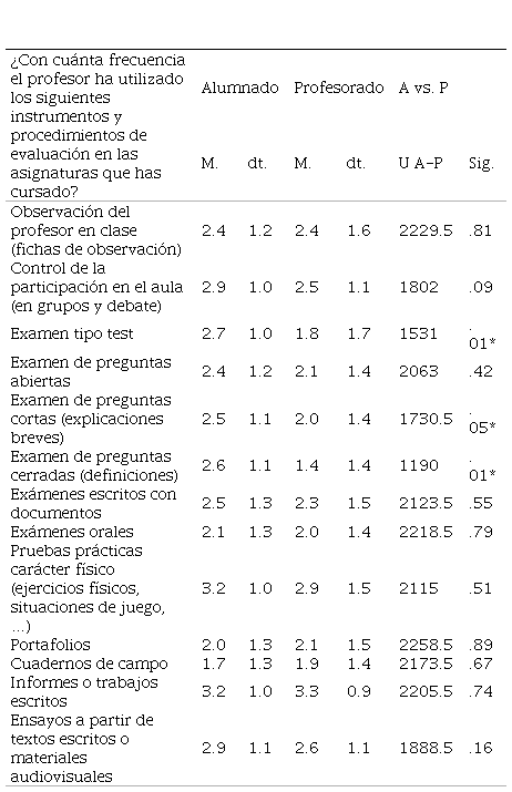 En la Tabla 3, se puede ver cómo, a juicio del alumnado y el profesorado, los procedimientos más utilizados son las pruebas prácticas de carácter físico y los informes o trabajos escritos. Sin embargo, existen diferencias significativas respecto a la frecuencia con la que se utilizan los “exámenes tipo test”, “exámenes de preguntas cortas” y “exámenes de preguntas cerradas”; según las valoraciones del alumnado, estos instrumentos se utilizan más de lo que el profesorado manifiesta.