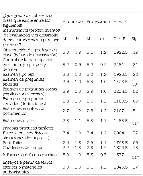 El grado de coherencia entre los instrumentos/procedimientos de evaluación y el desarrollo de competencias para ser profesor, se da en mayor medida a juicio del alumnado y profesorado en “pruebas prácticas carácter físico”, con una valoración que se ubica entre alta y muy alta. Con respecto a las diferencias significativas, estas se ubicaron en los “exámenes de preguntas abiertas”, “exámenes orales” e “informes o trabajos escritos”, en los tres casos, con una percepción de coherencia significativamente mayor por parte del profesorado.