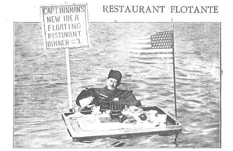 Otros asuntos provocarían cierta hilaridad en el lector actual. Véase, si no, el sombrero confeccionado con colas de bacalao (Alrededor del Mundo, 21-11-1921, p. 4) o el diseño de un restaurante flotante en la playa de Coney Island (figura 2) para "socorrer a los bañistas que en medio del agua se sientan acometidos de las cosquillas del apetito, para lo cual ha inventado un chaleco salvavidas dispuesto de manera que en él pueda sujetarse una mesa con todos los cachivaches y viandas necesarios para hacer un almuerzo a flote" (Alrededor del Mundo, 6-6-1921, p. 11).