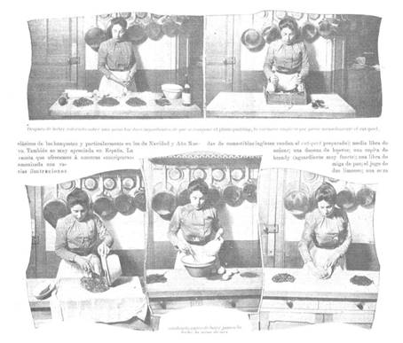 Acaso, lo más interesante desde la comunicación se halle en el uso de fotografías para explicar la elaboración de recetas, lo que obedecía a las nuevas tendencias en el diseño de la prensa que llegaba de EE.UU. Los periódicos comenzaron en los años veinte y treinta del siglo XX a ser mapas visuales en aras de la legibilidad (Díaz Noci, 1998, p. 2); de ello, no escapó tampoco el periodismo culinario. Se observa por primera vez, y casi única, en La Última Moda, cuando a principios de 1903 anunció el inicio de una nueva sección titulada "Arte culinario", firmada por Cordón Bleu. Durante ese año y el siguiente, publicó recetas acompañadas de fotografías en las que una cocinera mostraba cómo prepararlas (figura 3).