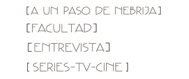 Una vez decidido el diseño de la cabecera de la revista, se han trabajado en consonancia con ella, todas las cabeceras de sección que aparecen en las páginas interiores y que en este primer número han sido: "Opinión", "Entrevista", "Facultad", "Reportaje", "Series-TV-Cine", "A un paso de Nebrija" y "Agenda". Todas ellas van entre corchetes, al igual que la cabecera pero con una tipografía más desenfadada, Creative. Este mismo recurso también lo utilizan los pies de página facilitando el recorrido por la publicación.