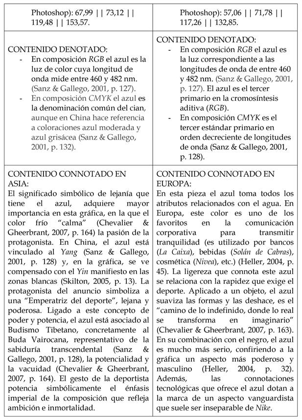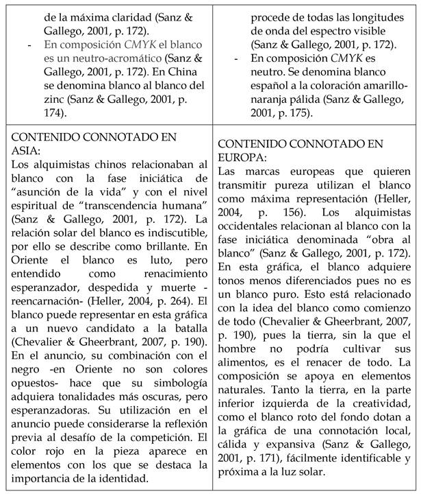 ABSTRACT: The different perceptions of color according to each socio-cultural context constitute a matter of relevant interest from the point of view of advertising creativity: black & white, for example, means mourn in different cultures and therefore must be used with care in international advertising. Color red is important to catch the western audience eye... but in China it is also perceived as a lucky color, which is by itself a powerful claim for potential customers. Therefore, this piece of research has analyzed the creative possibilities that can derive from the symbolic and cultural connotations of colors. To this end, a comparative analysis has been proposed in the design of which different theories on the perceptions of color have been considered in two very different cultures: European and Asian. This model has been used to analyze a sample of Nike graphic campaigns in order to obtain results that allow us to corroborate, through this case, that large brands use chromatic symbology in the design of their graphic campaigns in order to expand their possibilities of communicative effectiveness.