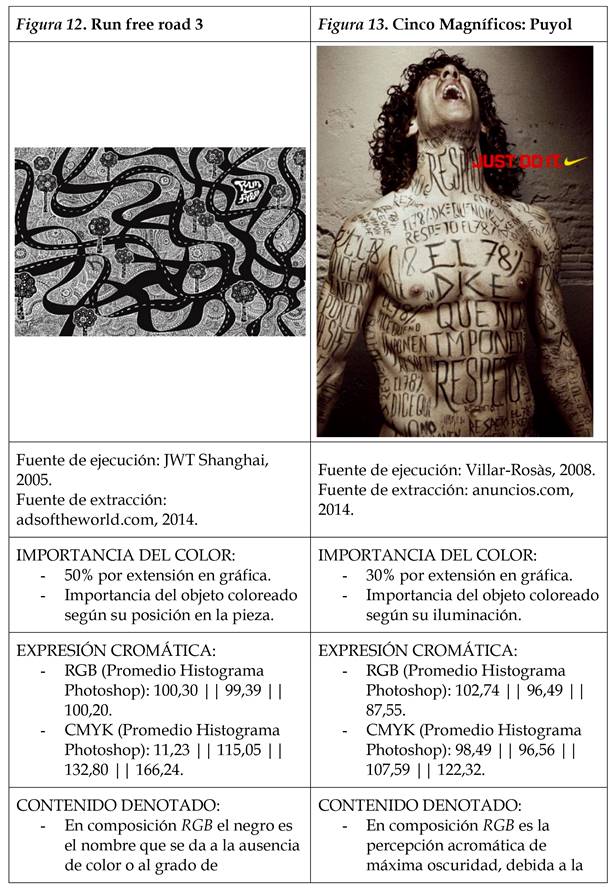 Las marcas siempre han fundamentado su propia construcción en una comunicación apoyada en la simbología de formas y colores. Así, el swoosh de Nike (emblema corporativo de la marca) se ha encumbrado como símbolo de victoria, reto y superación (García García, Llorente Barroso & García Guardia, 2010, p. 139), recurriendo a metáforas formales, simbólicas e implícito de alto grado de abstracción (Llorente Barroso & García García, 2015a, p. 489). La significación de este símbolo responde, en gran medida, a las connotaciones que emanan de su presencia predominante en color negro para representar a la marca deportiva. En este cromatismo reside la sencillez y funcionalidad (Heller, 2004, pp. 140-149) de su insignia corporativa.