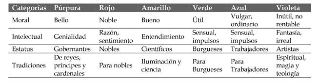 El sistema CMYK (Cyan, Magenta, Yellow, Key), síntesis sustractiva o proceso de cuatricromía se refiere a los colores pigmentos (Gatter, 2005, p. 39). El desarrollo de este sistema fue necesario para solventar las necesidades gráficas y posibilitar la reproducción de imágenes a color mediante la adición de tintas (Ambrose & Harris, 2006, p. 32-33). El sistema CMYK está formado por cuatro colores fundamentales: por un lado, cian, magenta, amarillo, que son los únicos pigmentos que no se pueden obtener por la mezcla de otros, y por otro lado, el negro (key)2, que tampoco puede ser conseguido tras modificaciones, motivo por el que se incluyó como pigmento base (Gatter, 2005, p. 42). La cuatricromía traduce la información cromática compuesta de luces (RGB), de manera que las luces primarias coinciden con los colores pigmento secundarios y los colores pigmento de base lo hacen con las luces secundarias (Carreres Ribera, 2011, p. 22). Este sistema se apoya en algunos de los hallazgos de Goethe que, a diferencia de Newton, basaba su teoría en métodos cualitativos. Newton consideraba a los colores como rayos acromáticos de luz (Goethe, 2002, p. 50), sin embargo, Goethe elaboró una teoría basada en el estudio de la naturaleza y sus diferentes formas de representación (Goethe, 2002, p. 13). Sus grandes aportaciones al estudio del color han sido: la consideración de los significados simbólicos que cada color puede tener (Ferrer, 1999, p. 82) y su clasificación según las características morales, intelectuales, de estatus y tradiciones de cada contexto (Heller, 2004, p. 117; Tabla 1). El inconveniente práctico de la aportación de Goethe es que no concebía las mezclas, por lo que no diferenciaba el comportamiento de las combinaciones entre pigmentos -más colores, mezcla más oscura- del de las combinaciones entre luces -más colores, mezcla más clara- (Heller, 2004, p. 282-283).
