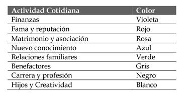 En relación con estas asociaciones, una parte del Feng Shui trata la importancia del uso de los colores para alcanzar el equilibrio con el entorno, vinculando cada color con una actividad cotidiana (Tabla 2):