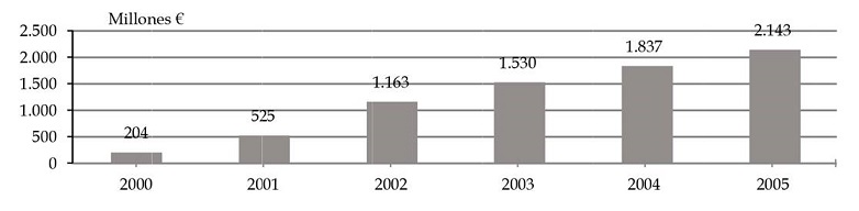 Desde el nacimiento de la web hasta 20051, vivimos la era del modelo web 1.0 cuyos intereses y objetivos principales fueron: los contenidos, la rentabilidad, el público masivo y el comercio (Nafría, 2008). La tienda digital Amazon, las webs de viajes Travelocity o Expedia entre otras muchas, fueron el máximo exponente de lo que permitía Internet. En el ámbito del comercio electrónico, en España, el modelo web 1.0 tuvo un éxito sin precedentes tal y como lo demuestran sus cifras de negocio (Figura 1).