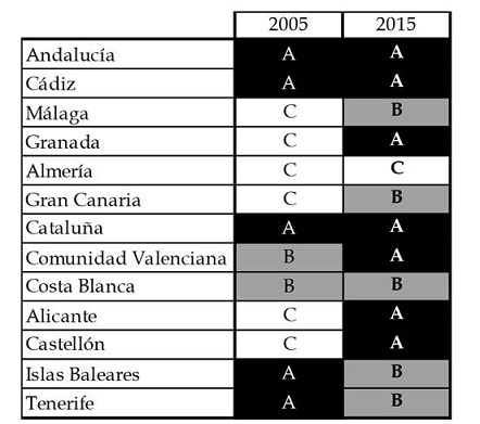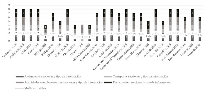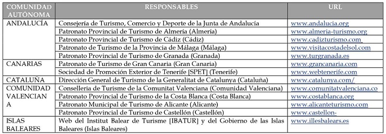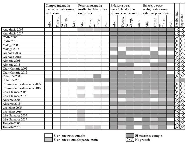 En cuanto a la evolución cabe constatar que en general la mayoría han mejorado en cuanto a cantidad y calidad de contenidos. Las webs de la Comunidad Valenciana, Alicante, Castellón y Granada logran la puntuación máxima pues han ampliado los contenidos iniciales relativos a alojamientos, transporte, actividades complementarias y restauración. Andalucía, Cádiz y Cataluña se mantienen en el primer grupo. Gran Canaria mejora notablemente pero no alcanza la puntuación máxima porque en lo relativo a restauración solo ofrece información genérica. Costa Blanca y Almería mantienen la misma puntuación, la primera porque sigue ofreciendo información parcial en relación al transporte; la segunda porque no ofrece contenido alguno relativo a alojamientos y restauración. Ambas secciones se presentan bajo la forma de un buscador denominado "Socios" que no muestra resultados. El título permite intuir que se trata de una sección en desarrollo que se completará con datos de socios registrados. Islas Baleares y Tenerife que en la primera fase de la investigación estaban en el primer grupo pierden esta posición. La primera porque en la nueva versión no ofrece contenidos específicos relativos a restauración. En la segunda ocurre lo mismo y además la información relativa a compañías aéreas es parcial solo hace mención de una compañía de carácter local, Binter, obviando las nacionales e internacionales.