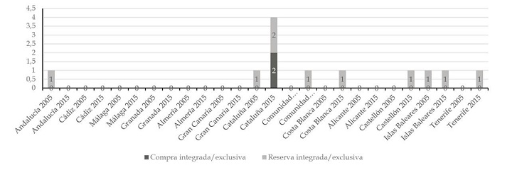 En el año 2005 solo tres webs implementan aplicaciones para el cumplimiento de la función comercial, y en todos los casos solo se permite la reserva de algunos productos y servicios. Andalucía ofrece un enlace a una plataforma propia, Séneca, consistente en una central de reservas de cualquier servicio turístico en las ocho provincias andaluzas, pero no está integrada en la web. Tampoco lo está la que ofrece Islas Baleares para la reserva de alojamientos. Esta es gestionada por una agrupación de cadenas hoteleras. Solo Cataluña ofrece, de forma exclusiva y de manera integrada la posibilidad de reservar uno de los cuatro tipos de servicios analizados: entradas para museos y monumentos.