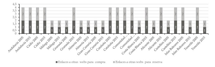 En la segunda fase de la investigación, la tendencia se mantiene y las webs peor calificadas en lo relativo a contenidos son también en su mayoría las que menos enlaces a otras webs ofrecen. Almería, no incluye datos ni enlaces de empresas y organizaciones especializadas en restauración y alojamiento; Islas Baleares y Tenerife ofrecen información parcial relativa al transporte y solo genérica en relación a la restauración, y en consecuencia no proporcionan enlaces a webs de empresas de este sector.