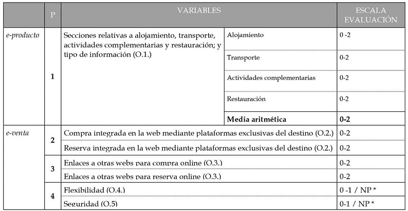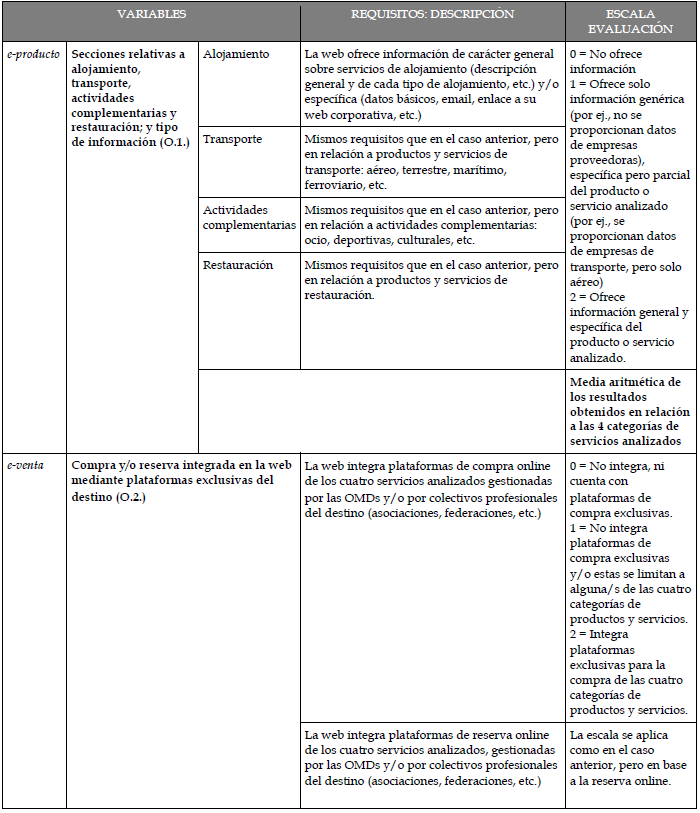 La metodología de la presente investigación es empírico-analítica. Parte de una revisión bibliográfica sobre marketing e Internet en el sector turístico y sobre la evolución de la función comercial de los sitios webs y más específicamente de los turísticos oficiales. Se realiza también un estudio exploratorio de las webs turísticas oficiales españolas de los destinos cuya oferta se centra en el producto sol y playa para evaluar la evolución de la implementación de herramientas y funcionalidades comerciales desde la llegada del modelo 2.0. Su análisis contempla 4 parámetros (P) acordes a los objetivos planteados (Tabla 1). La descripción de las variables, de sus requisitos, así como de la escala de evaluación pueden consultarse en el Anexo.