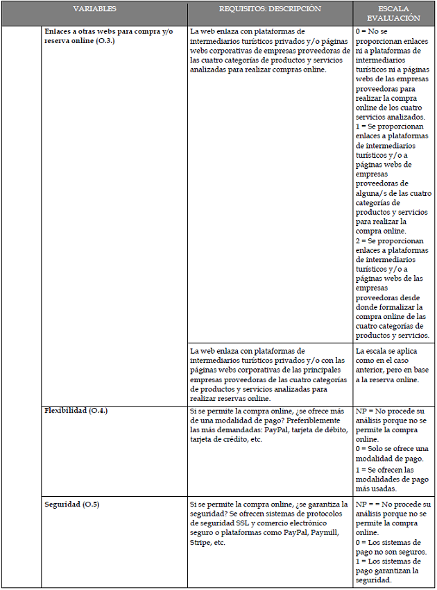 La recopilación de datos se realiza a partir de un análisis de contenido de las webs. Los resultados se trasladan a unos formularios diseñados ex profeso, e inspirados en metodologías de análisis e investigaciones previas de páginas webs turísticas oficiales (Díaz-Luque et al., 2006; Díaz-Luque et al., 2004; Díaz-Luque y Jiménez Marín, 2013; Fernández Cavia et al., 2013a, 2013b; Fernández-Cavia et al., 2013; Huertas Roig y Fernández Cavia, 2006), donde son cuantificados en base a dos escalas. Una escala binaria (0-1) para el análisis de la flexibilidad y la seguridad, y una escala 0-2 para el resto de variables dado que sus indicadores pueden darse, aunque no en condiciones óptimas.