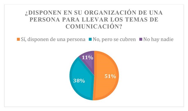 Pero, la mayoría de estas, el 62%, la mayoría, sí que cuentan con una persona encargada de gestionar los temas de comunicación. Solamente un 15% no tienen a nadie que lo gestione. El 23% restante no cuentan con una persona encargada, pero afirma que estas labores están cubiertas.