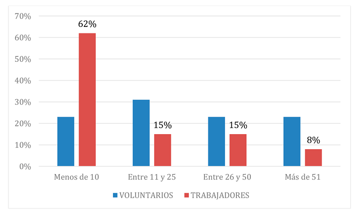 Para responder esta pregunta dividimos estos recursos entre personal contratado y voluntarios. Así, el 62% de las entidades cuentan con menos de 10 trabajadores entre su plantilla, solamente el 8% cuenta con más de 51 asalariados. Por otro lado, el número de voluntarios se equipara entre las franjas propuestas, siendo mayor, un 31%, entre 11 y 25 voluntarios (Figura 3):