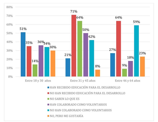 En la siguiente tabla observamos la formación recibida por franjas de edad, algo que deberían de plantearse las entidades del TS para apostar por los voluntarios. Aunque esta no sea la única misión de la educación para el desarrollo, comprobamos en la siguiente tabla por edades el porcentaje de población que ha recibido esta educación, y el porcentaje de ellos que han colaborado alguna vez como voluntarios.