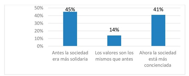 En cuanto a los valores solidarios no hay una tendencia destacable, como vemos en el siguiente gráfico, ya que están muy igualados los que piensan que antes la sociedad era más solidaria y los que creen que actualmente está más concienciada (Figura 5).
