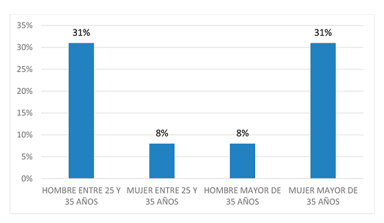 El perfil de estos trabajadores se resume del siguiente modo: hombre entre 25 y 35 años y mujer mayor de 36 años, ambos con un 31%. En la Figura 6, observamos el resto de perfiles: