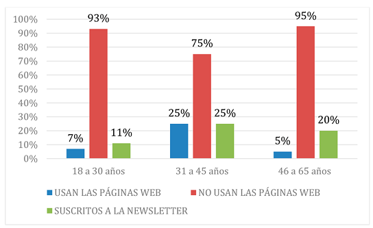 Las tres franjas de edad encuestadas responden con un porcentaje mayor al 50% que no usan las páginas web de las entidades, siendo la población entre 31 y 45 años los que más las visualizan con un 25%.