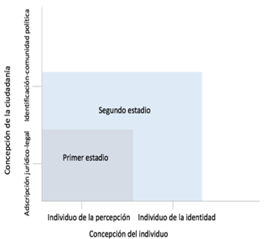 Ahora bien, a modo de balance, si se hace un cruce entre la concepción de ciudadanía y de individuo que subyace en la mayoría de las investigaciones sociales encontraremos dos estadios básicos. El primero referido a los estudios que relacionan una ciudadanía de corte legalista y normativa a través de percepciones o representaciones de los individuos (a esta noción la llamo “el individuo de la percepción”). Un segundo estadio estaría formado por la superposición entre una noción de la ciudadanía como construcción identitaria en el individuo. Lo anterior podría representarse de la siguiente manera: