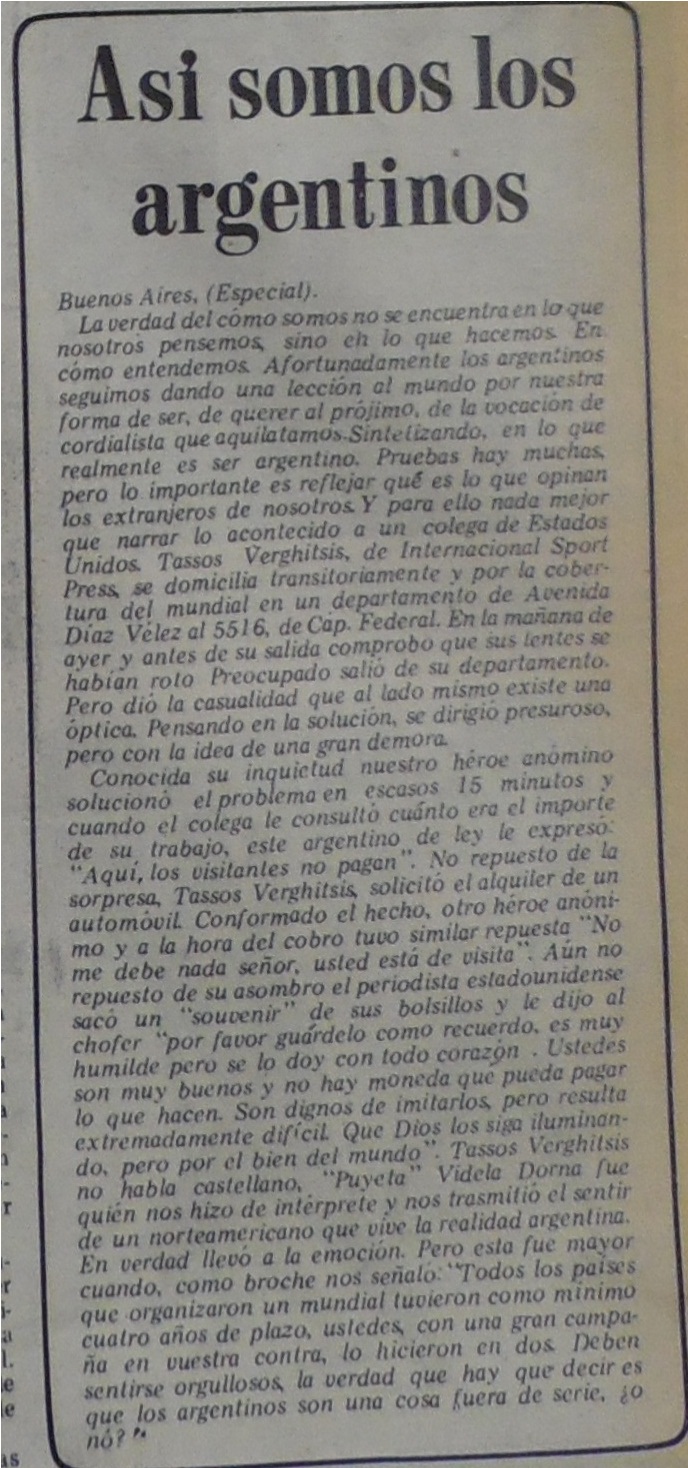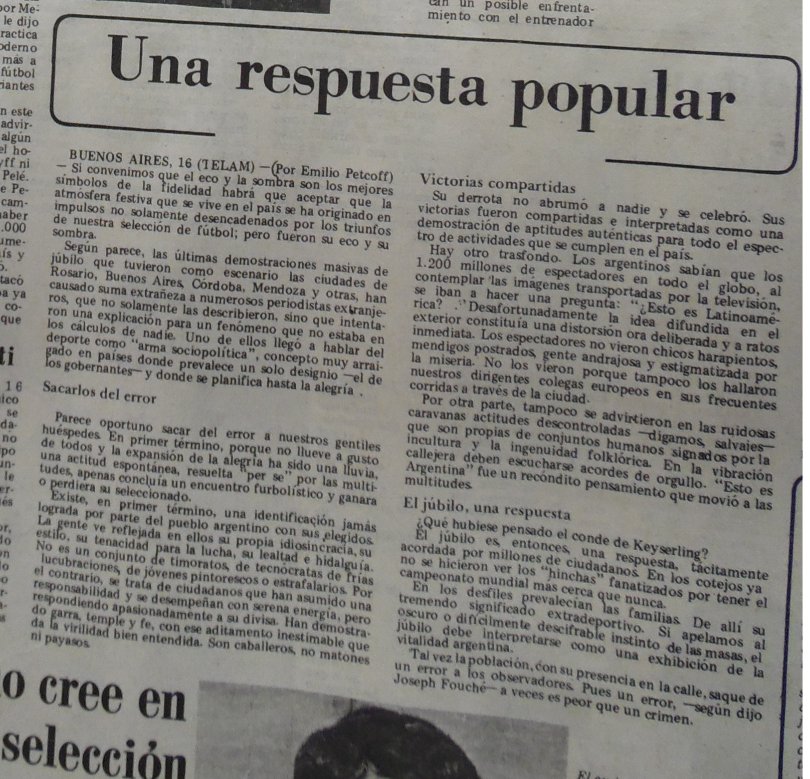 Según parece, las ultimas demostraciones masivas de júbilo que tuvieron como escenario las ciudades de Rosario, Buenos Aires, Córdoba, Mendoza y otras, han causado suma extrañeza a numerosos periodistas extranjeros que no solamente las describieron, sino que intentaron una explicación para un fenómeno que no estaba en los cálculos de nadie. Uno de ellos llegó a hablar del deporte como un arma sociopolítica, concepto muy arraigado en países donde prevalece un solo designio –el de los gobernantes– y donde se planifica hasta la alegría (...) Parece oportuno sacar del error a nuestros gentiles huéspedes6.