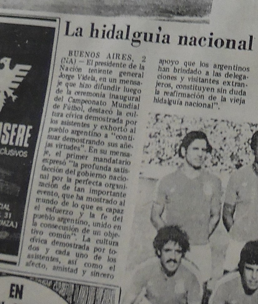 En esta nota se asimila la obtención de la copa mundial a una copa de reconocimiento por los valores demostrados ante la mirada extranjera. No solo importa el triunfo deportivo, que por muchos momentos pasaba a segundo plano, lo importante para el discurso oficial era contrarrestar la imagen que se había transmitido por la denominada campaña antiargentina y demostrar, según ellos, “cómo somos los argentinos”.
