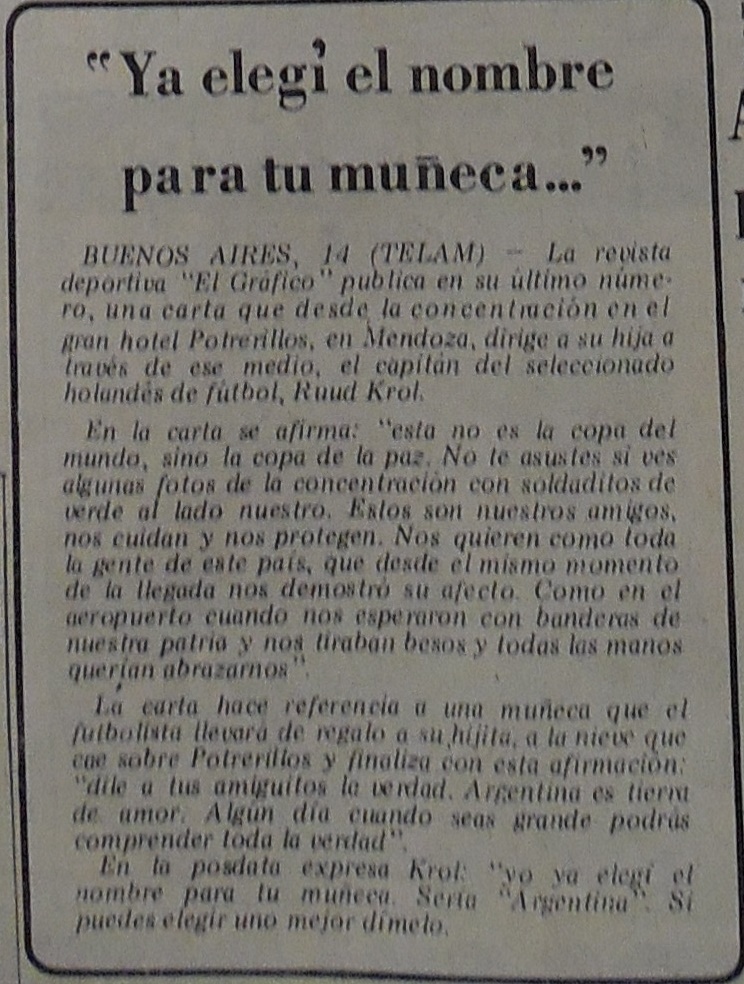 Lo más llamativo es una situación que se dio a través de una supuesta carta firmada por Ruud Krol, publicada por la revista deportiva El Gráfico, y que fue replicada en el suplemento Los Andes con el Mundial. En la misma, el defensor holandés relataba a su hija una historia relacionada con el nombre de una muñeca que –al parecer– le llevaba de regalo a su regreso. Lo curioso es que este relato se adecuaba exactamente al discurso que la dictadura implementó alrededor del Mundial.