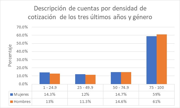 Conforme a la figura 1, para densidades de cotización menores a 75%, las mujeres representan una mayoría, pero para densidades de cotización superiores a 75%, la relación se invierte y los hombres son el grupo más amplio, aunque la diferencia para todos los casos de densidad de cotización no es holgada.