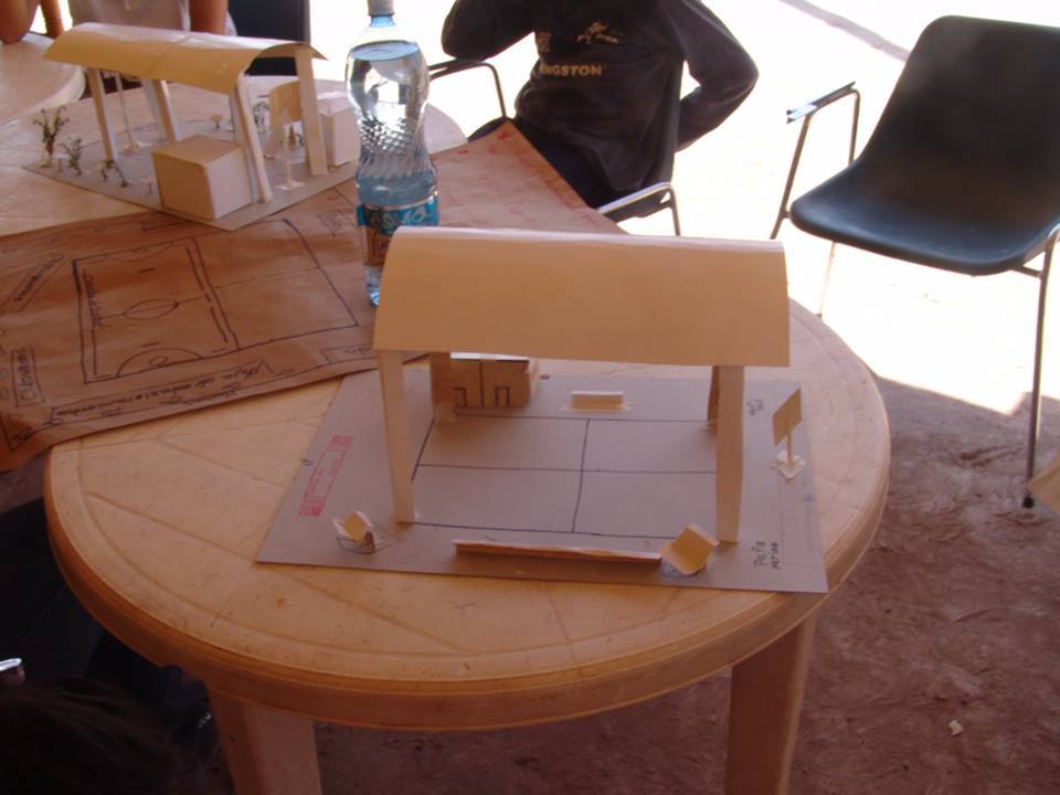 Al inicio, Ando Habitando entró en relación con el grupo Cumpuchu Huarpe para realizar aportes técnicos desde la arquitectura en la construcción del playón. La relación entre las /os jóvenes con las arquitectas, se basaba en poner en diálogo el deseo de Cumpuchu Huarpe con los saberes técnicos para que la materialización de la obra respondiera a lo que ellos procuraban. El diseño del playón y de su entorno era una parte fundamental. Para ello, Ando Habitando realizó dos talleres de diseño participativo7 con el grupo de jóvenes, para la construcción colectiva de maquetas y planos del espacio común. El objetivo de esos talleres era poner en diálogo diferentes saberes, de modo que el diseño (ubicación del equipamiento, las características y los costos) plasmado en las maquetas y planos respondieran a la demanda de Cumpuchu Huarpe y, a su vez, que fuera plausible de ser usado para la futura construcción del playón.