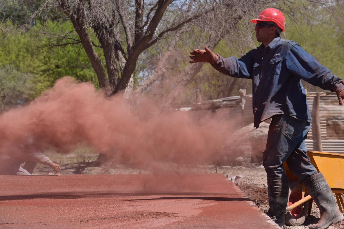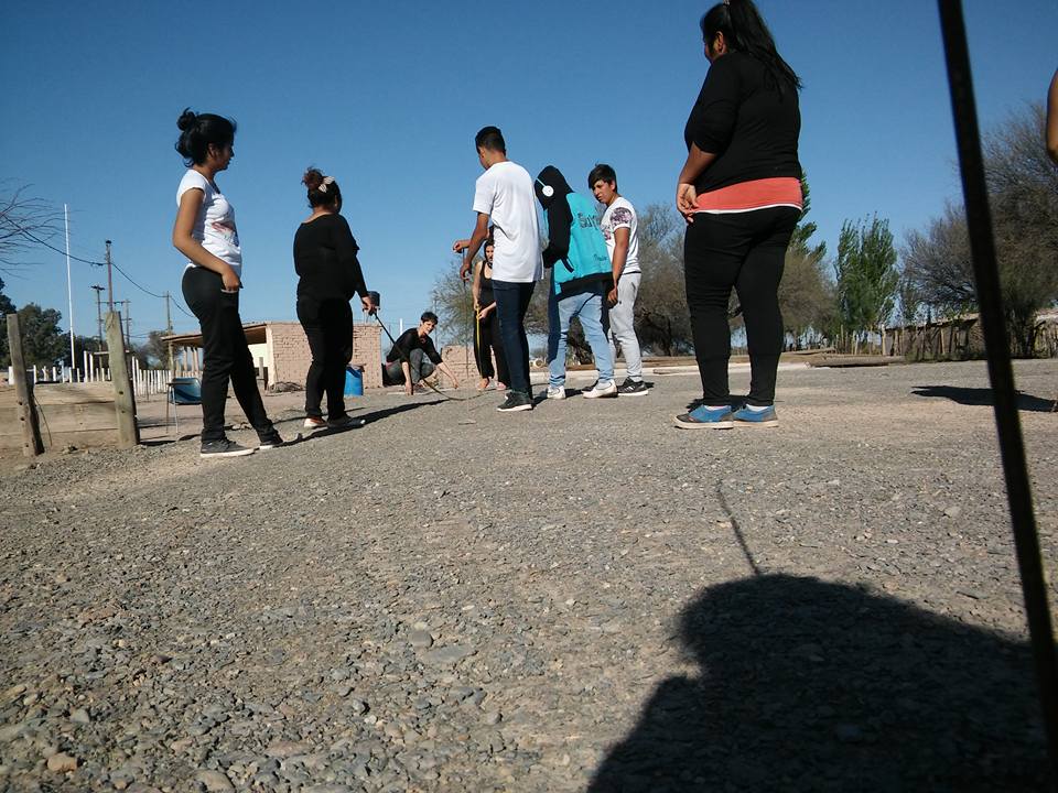Esto implicó reconocer las características propias del lugar con sus potencialidades y dificultades para realizar la obra. En el marco de estas definiciones, las y los jóvenes se pusieron en contacto con las autoridades del club deportivo del poblado, donde decidieron en conjunto que el playón se construiría al lado del club. De esta manera, el grupo se ahorraba materiales de construcción ya que el club cuenta con instalaciones, como baños, agua y un depósito para guardar material deportivo. Por otro lado, algunos/as integrantes de Cumpuchu Huarpe deseaban construir espacios verdes, alrededor de la obra. Esto era difícil de proyectar ya que un problema que persiste en la zona es la escasez de agua. Finalmente desistieron, al reconocer el ambiente y crear una estética del lugar que no respondiera a las formas típicas de una ciudad.