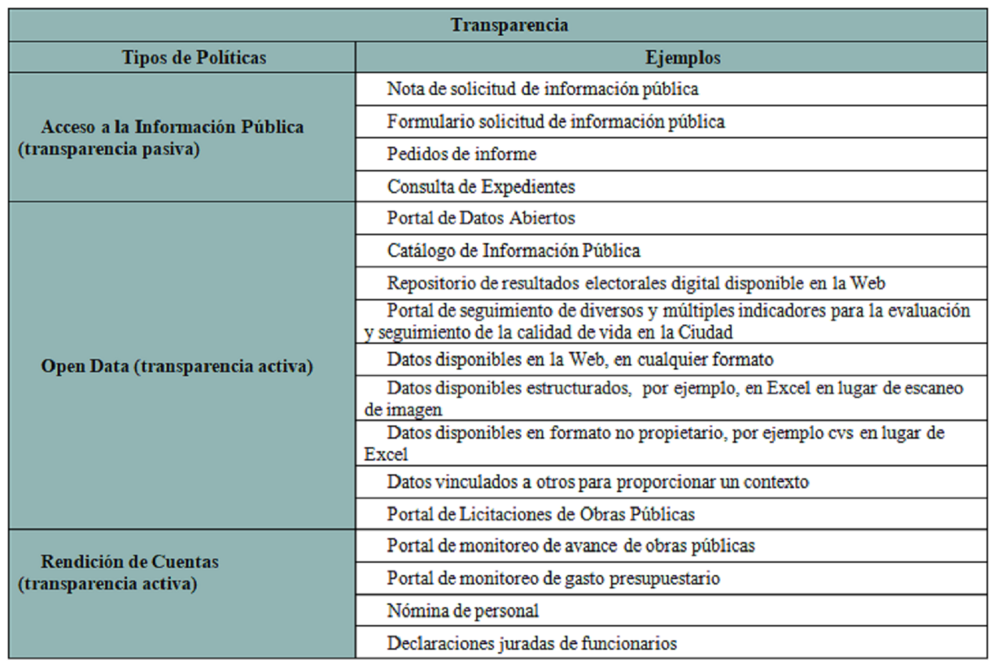 Entre los tipos de políticas que forman parte de la transparencia podemos distinguir las de “Acceso a la Información Pública”, que son aquellas en donde la transparencia es pasiva, es decir que la Administración proporciona la información sólo a raíz de un pedido de la misma por parte de algún ciudadano en particular; aquellas que pertenece al campo de la “Open Data”, en donde la transparencia es activa, ya que la Administración por sí misma es la que proporciona la información y la pone a disposición de la ciudadanía en general; y por último aquellas políticas que también siendo de tipo activo, son denominadas “Rendición de Cuentas” porque hacen estrictamente a la ética y la responsabilidad de la función pública (De Blasio, 2016). Sobre este punto, Jonathan Fox, profundiza: