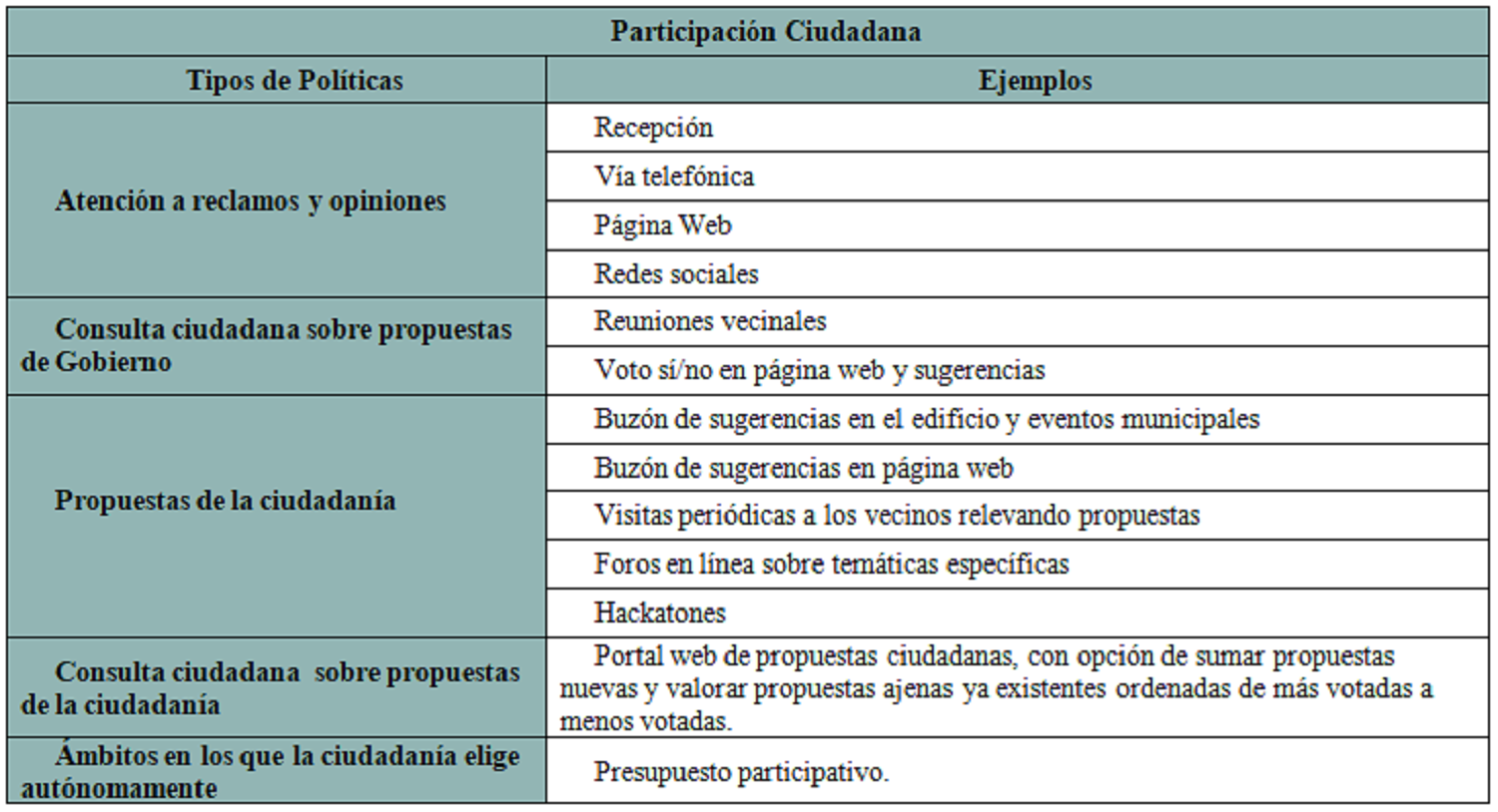 Son cinco los tipos de políticas de Participación Ciudadana que se pueden nombrar: Atención a reclamos y opiniones y algunos ejemplos de ello pueden ser la Recepción o Mesa de Entradas en la Administración; o vía telefónica al número institucional de contacto; o mediante la página web oficial; o bien, las redes sociales pueden también funcionar como vía de recepción de opiniones y reclamos. El siguiente tipo es la Consulta ciudadana sobre propuestas de Gobierno y algunos ejemplos podrían ser Reuniones vecinales con funcionarios de gobierno para escuchar en primera persona las sugerencias y opiniones de los vecinos; y también un Voto sí/no en página web y sugerencias por ese mismo medio. Luego, como otro tipo podemos nombrar las Propuestas de parte de la misma ciudadanía, y sobre ello hay varios ejemplos: Buzón de sugerencias en el edificio y eventos municipales en donde los concurrentes puedan dejarlas anónimamente por escrito en un papel; un Buzón de sugerencias en la página web oficial de la Administración que puede ser anónimo o no; Visitas periódicas a los vecinos por parte de los funcionarios de gobierno relevando propuestas; Foros en línea sobre temáticas específicas que pueden ser propuestas por la Administración o por los mismos ciudadanos; y por último, los Hackatones, eventos organizados con el fin de programar o construir una solución de forma colaborativa durante un plazo determinado de horas, de preferencia en el mismo espacio físico. Otro tipo es la Consulta ciudadana sobre propuestas de la ciudadanía y un ejemplo de ello podría ser Portal web de propuestas ciudadanas con opción de sumar propuestas nuevas y valorar propuestas ajenas ya existentes ordenadas de más votadas a menos votadas. Y como último tipo de política de participación, aparecen los Ámbitos en los que la ciudadanía elige autónomamente, y el ejemplo principal es el Presupuesto participativo que es un mecanismo que incorpora el debate, el acuerdo y el voto ciudadano como herramientas que permiten destinar una parte del presupuesto de la Administración a la realización de propuestas y proyectos que las personas consideren necesarios para su comunidad” (De Blasio, 2016).