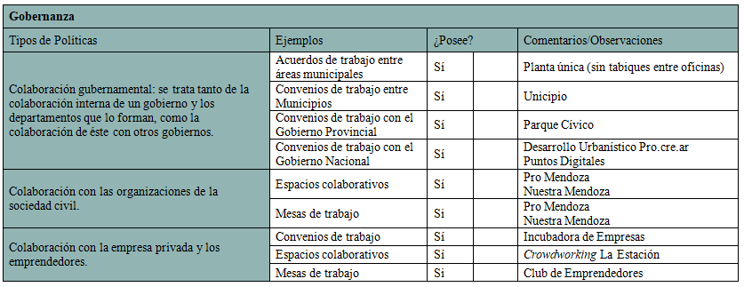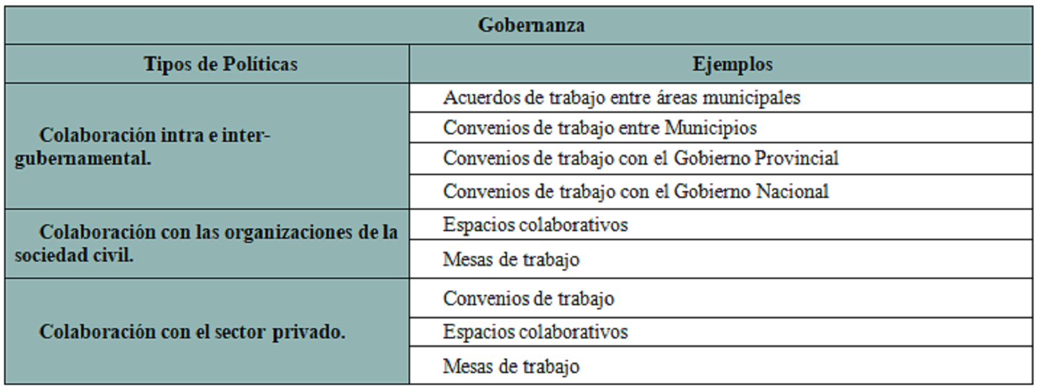 Hay tres tipos de políticas de Gobernanza, primero la Colaboración meramente gubernamental: la cual se puede tratar tanto de la colaboración interna de un mismo gobierno y los departamentos que lo conforman, como la colaboración de éste con otros gobiernos; cuyos ejemplos pueden ser los Acuerdos de trabajo entre áreas municipales para tratar alguna necesidad específica de la comunidad; los Convenios de trabajo entre Municipios que comparten algún o algunos intereses ya sea por cercanía o porque poseen características u objetivos similares; los Convenios de trabajo con el Gobierno Provincial y también los Convenios de trabajo con el Gobierno Nacional, y en la mayoría de estos casos ambos niveles de gobierno se sirven de estos acuerdos, el nivel superior se sirve de la proximidad de la Administración menor que permite una mayor facilidad de gestión, y por el contrario, la mayoría de las veces la Administración de menor nivel se sirve de los recursos que le pueden los demás niveles de Gobierno. Otro tipo es la Colaboración con las organizaciones de la sociedad civil, en Espacios colaborativos o Mesas de trabajo, por ejemplo en donde la Administración pueda escuchar de primera mano las necesidades del sector y coordinar soluciones entre ambos que propicie el trabajo de estas organizaciones con el apoyo que pueda brindar el Estado. Y por último, la Colaboración con la empresa privada y los emprendedores en forma de Convenios de trabajo, Espacios colaborativo o mesas de trabajo, igualmente, y aquí el Estado buscará apoyar al sector privado para que éste pueda desarrollarse de la mejor manera para la comunidad en su totalidad.