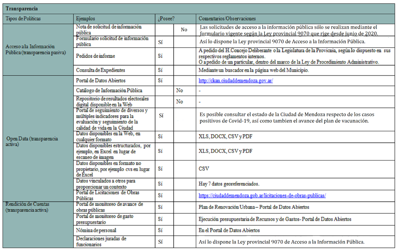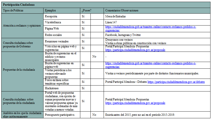 Finalmente, se logró relevar mediante análisis documental y entrevistas a informantes clave, las políticas públicas sobre transparencia, participación ciudadana y colaboración que se habían implementado en la Ciudad de Mendoza hasta la fecha actual y ponderar el modo en el que habían contribuido así al desarrollo de una plataforma de Gobierno Abierto.
