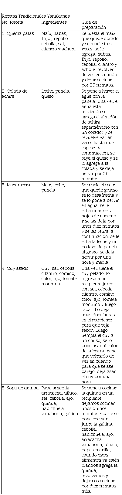 Algunos de las dietas son: en el desayuno consumen, arroz, huevo revueltos o cocidos arepa de maíz o choclo y tinto. -en el almuerzo, sopa de maíz, con frijol verde con cuy. -en la cena frijoles y arroz; como se evidencia hay una integración entre lo tradicional y la oferta del mercado, por un lado, el maíz como materia prima y la carne del curí, base de la alimentación de los pueblos indígenas y por otro lado el arroz producto cultivado a gran escala, se consigue en el comercio local. Una receta tradicional mencionada por los Yanakunas se prepara así: Sopa de maíz, (se muele el maíz, este se lava y se des afrecha, se coloca una olla con agua y los ingredientes sal, color, cebolla, manteca, frijol, ullucos, col, papa, se agrega en maíz luego el agua blanca y se cocina hasta que los ingredientes estén bien cocidos, con carne de curí).
