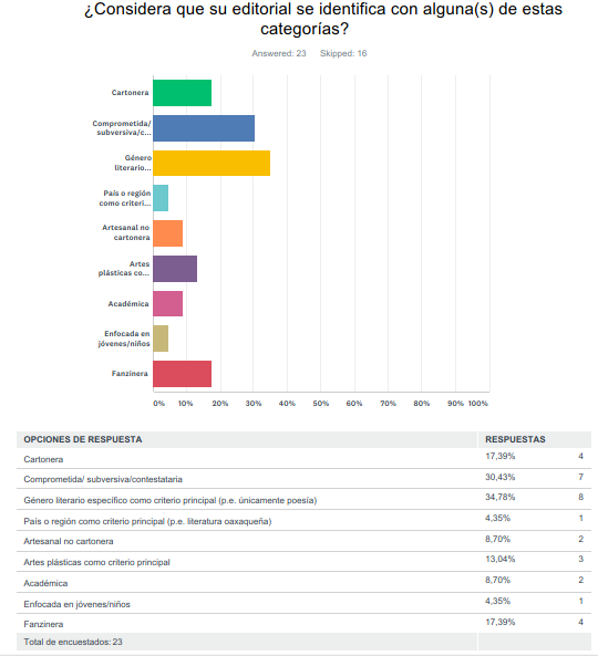 Se buscó identificar el criterio principal que diera sentido a cada proyecto y guiara sus asociaciones y semejanzas con otras editoriales. Las categorías propuestas son, por supuesto, discutibles y no excluyentes entre sí (por ejemplo, una editorial cartonera pudo escoger el criterio “cartonera” sin que esto implique que no pueda inscribirse también en la categoría de “comprometida/subversiva/contestataria”). Estas derivaron del mapeo que se hizo a partir de las descripciones de cada uno de los proyectos y un análisis general de su catálogo; a partir de lo que más destacaban en su descripción, se propusieron algunos ejes para agruparlas por intereses o prácticas comunes de publicación. Aunque dichos ejes fueron sugeridos en la encuesta, estaba la opción de poner “otro,” en caso de que no se sintieran identificados con los propuestos.