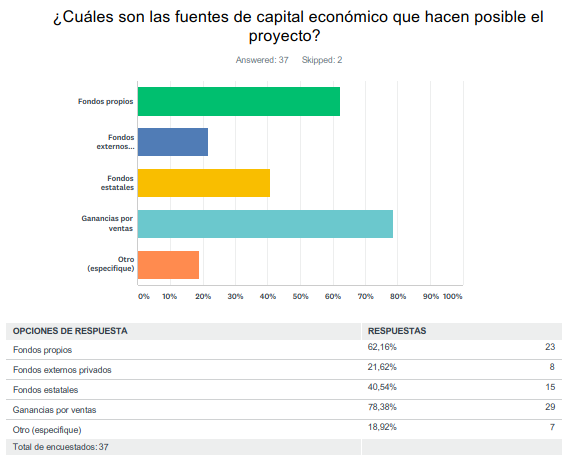 Las dos fuentes principales de capital económico son las ganancias por ventas y la inversión de fondos propios; 58% de los proyectos ha participado en convocatorias estatales y 33% en convocatorias de organizaciones no gubernamentales, lo cual demuestra cómo la subsistencia de la EI está en gran medida apoyada por instituciones externas estatales, sin que esto vaya en detrimento de la noción de los editores de una independencia basada más en la autonomía intelectual que en la económica.