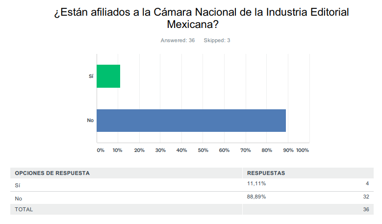 La mayoría de las editoriales no está afiliada a la caniem, y dentro de las razones encontramos las siguientes: desinterés por la falta de beneficios que trae a las editoriales pequeñas (9); no querer entrar en procesos de burocracia institucional (4); la naturaleza autónoma de la editorial no va en línea con ser parte de entes externos (4); el desconocimiento de la existencia de esta Cámara y sus funciones (4); las altas tarifas de afiliación (3); el no requisito de afiliación para poder operar como editorial (1); la dinámica de “amiguísimos” alrededor de la que opera y en la que no quiere entrar la editorial (1). Se da un panorama similar al preguntar por la afiliación a la aemi: