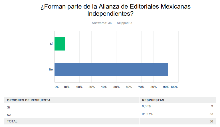 Por otro lado, el 25% de las editoriales afirmaron pertenecer a algún colectivo editorial (entendidos como grupos de trabajo colaborativo que no son parte de las actividades de la caniem y la aemi). Quienes están integrados a estos mencionaron reuniones con ilustradores y poetas en el espacio Alumbre, en Ciudad de México, y la cooperativa Taller de Producción Editorial, Fanzinorama y Editoriales Independientes de Jalisco. Otras afirmaron reunirse sólo para las ferias y otras mencionaron dos o tres editoriales afines con las que se comunican constantemente, pero que no constituyen un colectivo como tal. Es relevante mencionar que sobre este punto hubo respuestas como la de la editorial Edhalca, que aludía a la desconfianza, desorganización y desarticulación de las editoriales, lo cual apunta a una concepción de poca funcionalidad del trabajo en grupo, que en casos como este se extiende no sólo a la caniem y la aemi sino a la labor editorial en general.