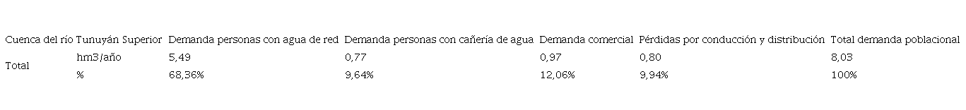 Tabla 6: Demanda actual de agua por parte del sector poblacional en la cuenca del río Tunuyán Superior según tipo de demanda. Por departamento. En hm3/año.
