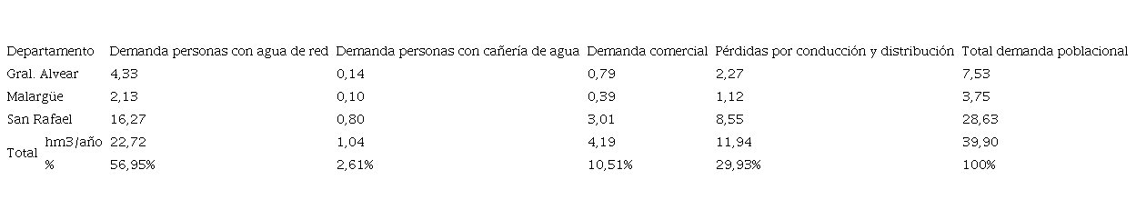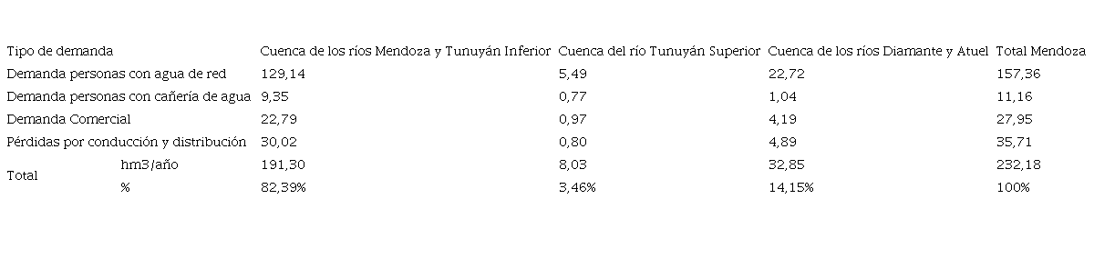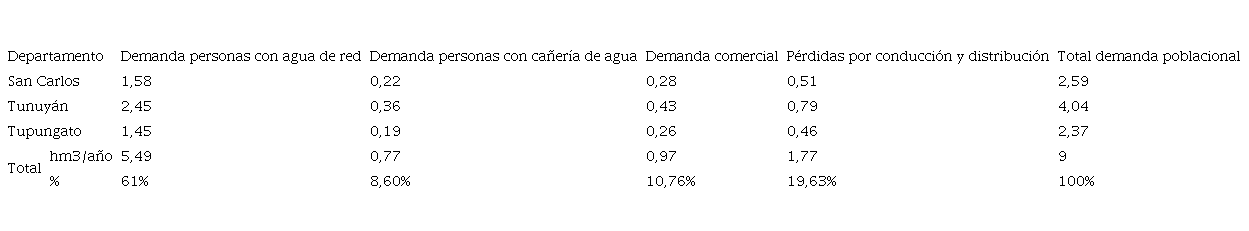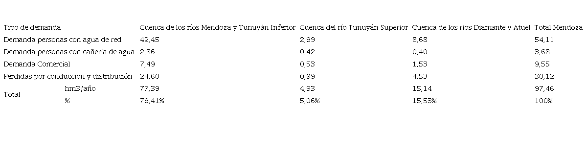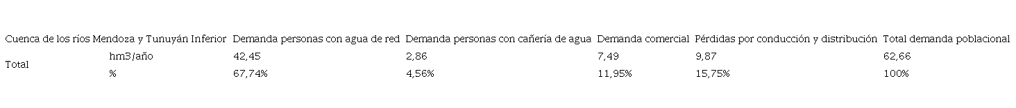 Los resultados de la demanda actual de agua por parte del sector poblacional (residencial y comercial) en la cuenca de los ríos Mendoza y Tunuyán Inferior son exhibidos en la Tabla 2.